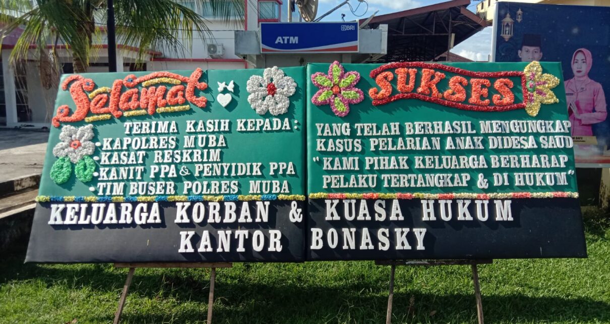 Musi Banyuasin – Terlihat hari ini Sabtu 27/04/2024 terpampang papan bunga didepan Mapolres Musi Banyuasin yang berisi ucapan terimakasih dan apresiasi dari keluarga korban, warga masyarakat desa Saud kecamatan Batanghari leko kepada Satuan Reserse kriminal (Reskrim) Polres Musi Banyuasin yang telah berhasil menyelamatkan korban penculikan.